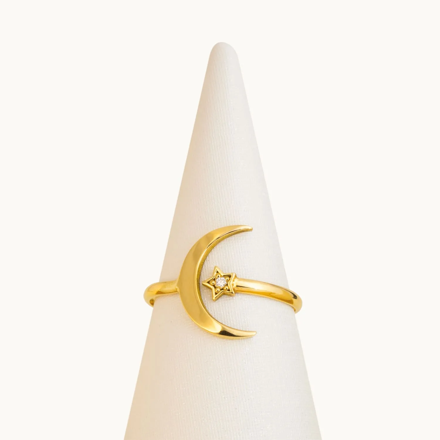 Anillo oro amarillo 18K | Luna y Estrella con diamante